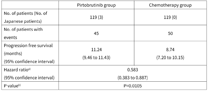The BRUIN-CLL-321 study enrolled a total of 238 patients (including 3 Japanese patients) with relapsed or refractory chronic lymphocytic leukemia (CLL) or small lymphocytic lymphoma (SLL) who were resistant or intolerant to covalent BTK inhibitors (e.g., ibrutinib, acalabrutinib, and zanubrutinib), who were randomized to receive pirtobrutinib 200 mg orally once daily ("the pirtobrutinib gorup") or investigator's choice of idelalisib [not approved in Japan] plus rituximab (IdelaR)1) or bendamustine plus rituximab (BR)2) ("the chemotherapy group). The primary endpoint was progression-free survival (PFS) assessed by an independent review committee (IRC). As the following table shows, PFS was significantly longer in the pirtobrutinib group than in the chemotherapy group.3)