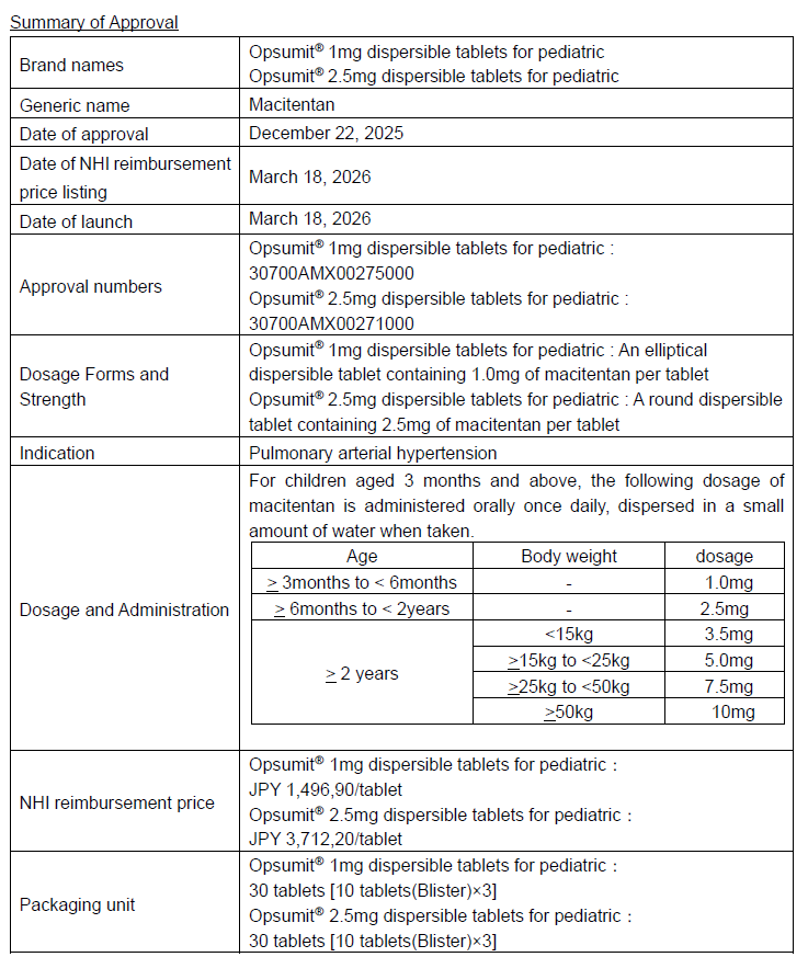 Japan’s Ministry of Health, Labor and Welfare (MHLW) for Opsumit® Pediatric Dispersible Tablets in 1 mg and 2.5 mg on December 22, 2025.