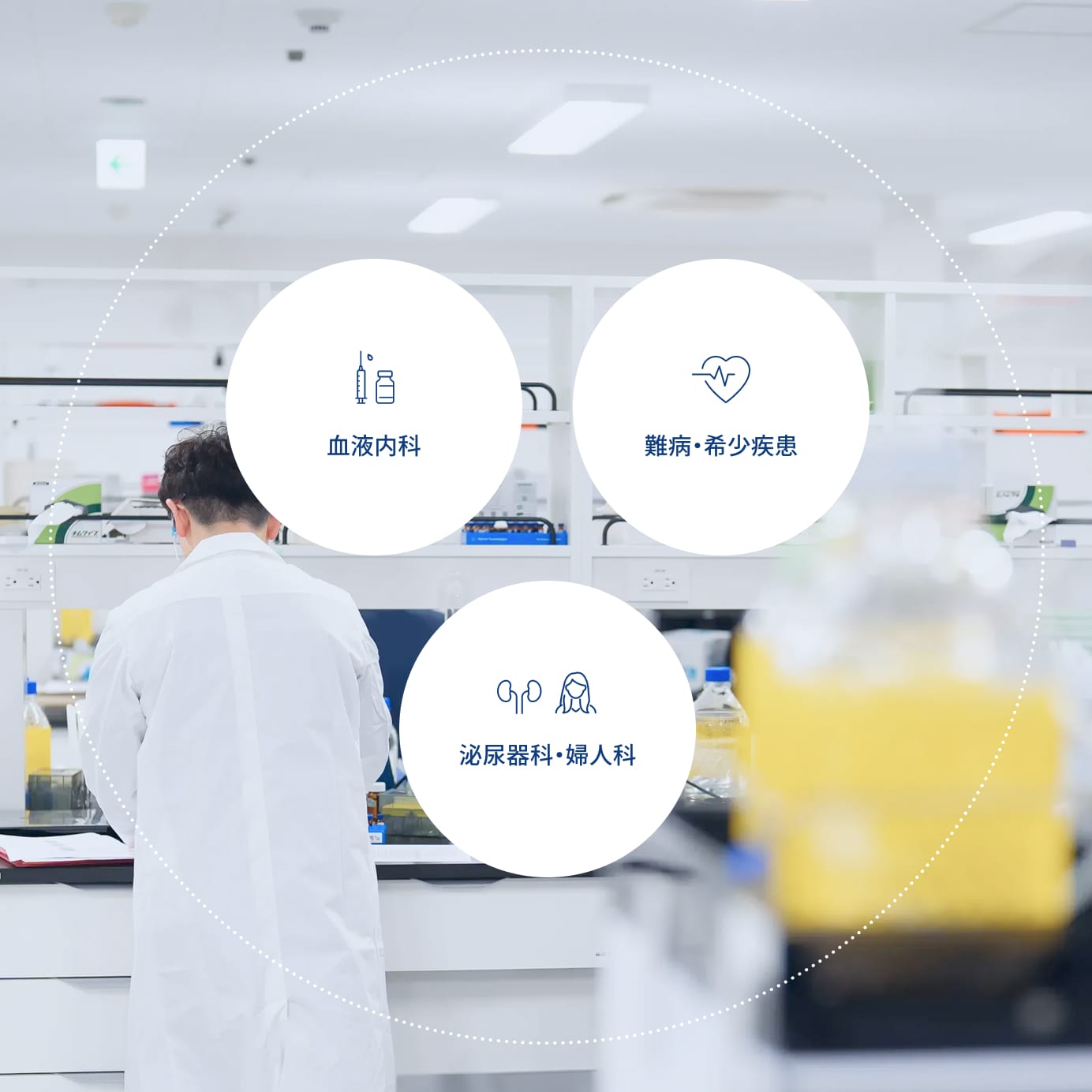私たちは、他社が手掛けない領域にも積極的に挑戦し、「血液内科」「難病・希少疾患」「泌尿器科・婦人科」の3つの領域に注力しています。