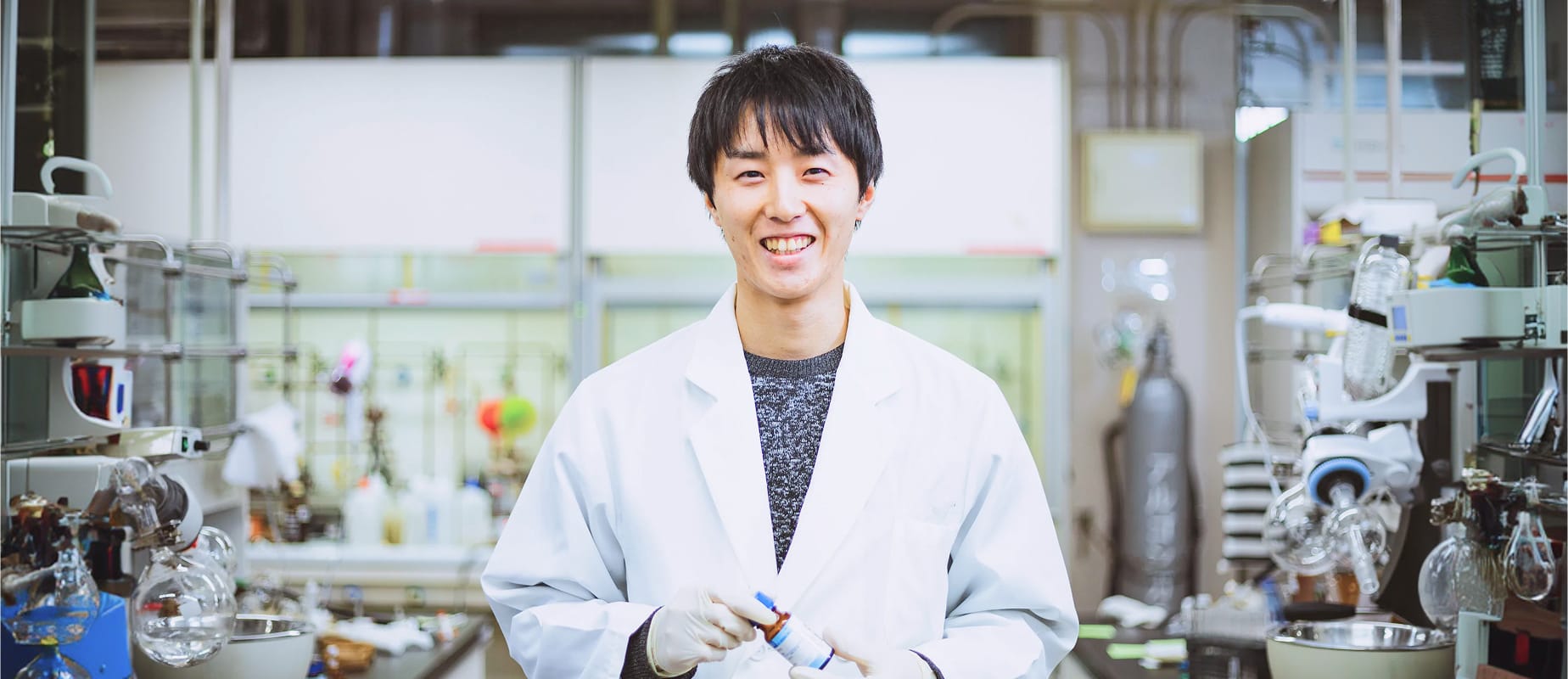 研究室では天然物(※生物が産生する有機化合物。特徴ある生理活性を持つものが多く知られている)の全合成研究をしていました。さまざまな化学反応を駆使して目的の化合物を作っていきますが、天然物は複雑な構造を有しているため、合成には苦労しました。その時身につけた有機化学の基礎知識や工夫をする姿勢は今でも活かされています。