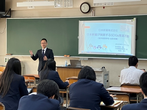 日本新薬の授業では、会社概要や業務紹介の後、当社が取り組むSDGs活動を紹介しました。生徒たちは熱心にメモを取り、製薬業界や当社の理念にも興味や共感を示していました。