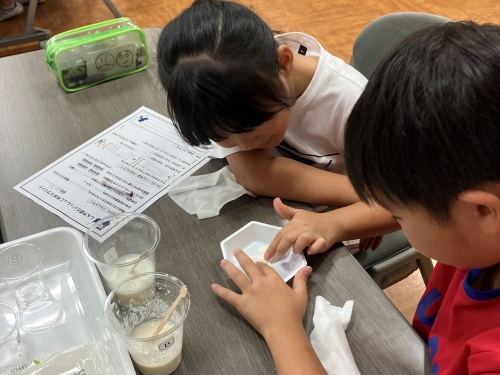 「たんぱく質」の授業では、牛乳とレモン汁を使ってカッテージチーズを作る実験を行いました。レモン汁で牛乳中のたんぱく質が変化する様子を体感し、さらに筋肉や皮膚、爪など身体の多くがたんぱく質からできていることを知って、驚く子どもたちの姿が印象的でした。