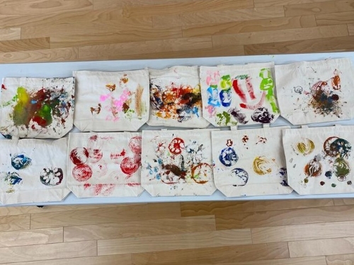 さらに、呉竹総合支援学校では、「食品ロス削減」をテーマに、野菜の廃棄部分を活用したバッグ作りを行いました。はじめに、さまざまな野菜の断面を写真やアニメーションで子どもたちに紹介した後、廃棄部分などを用いた野菜スタンプで、世界に一つだけのバッグを制作しました。完成品を披露してくれた子どもたちの笑顔は、社員にとっても大きな励みとなりました。