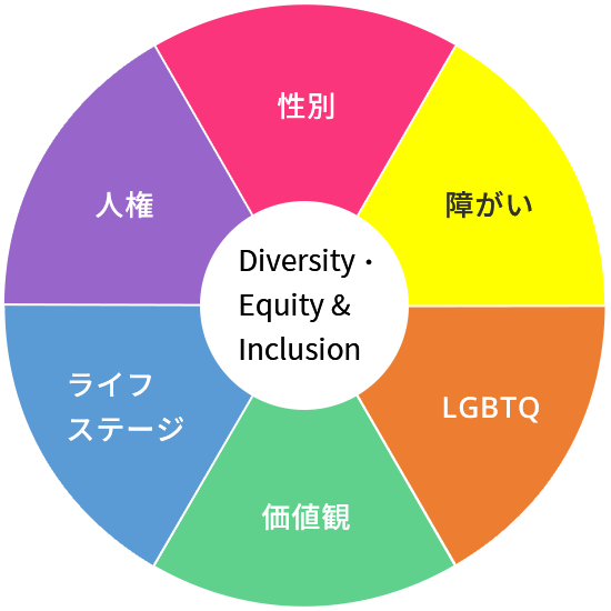 私たちは、性別・年齢・障がいの有無・国籍・人種などの違いはもとより、価値観・経験・働き方・文化・性のあり方(性的指向・性自認・性表現)などの違いも認め合い、多様性を尊重します。