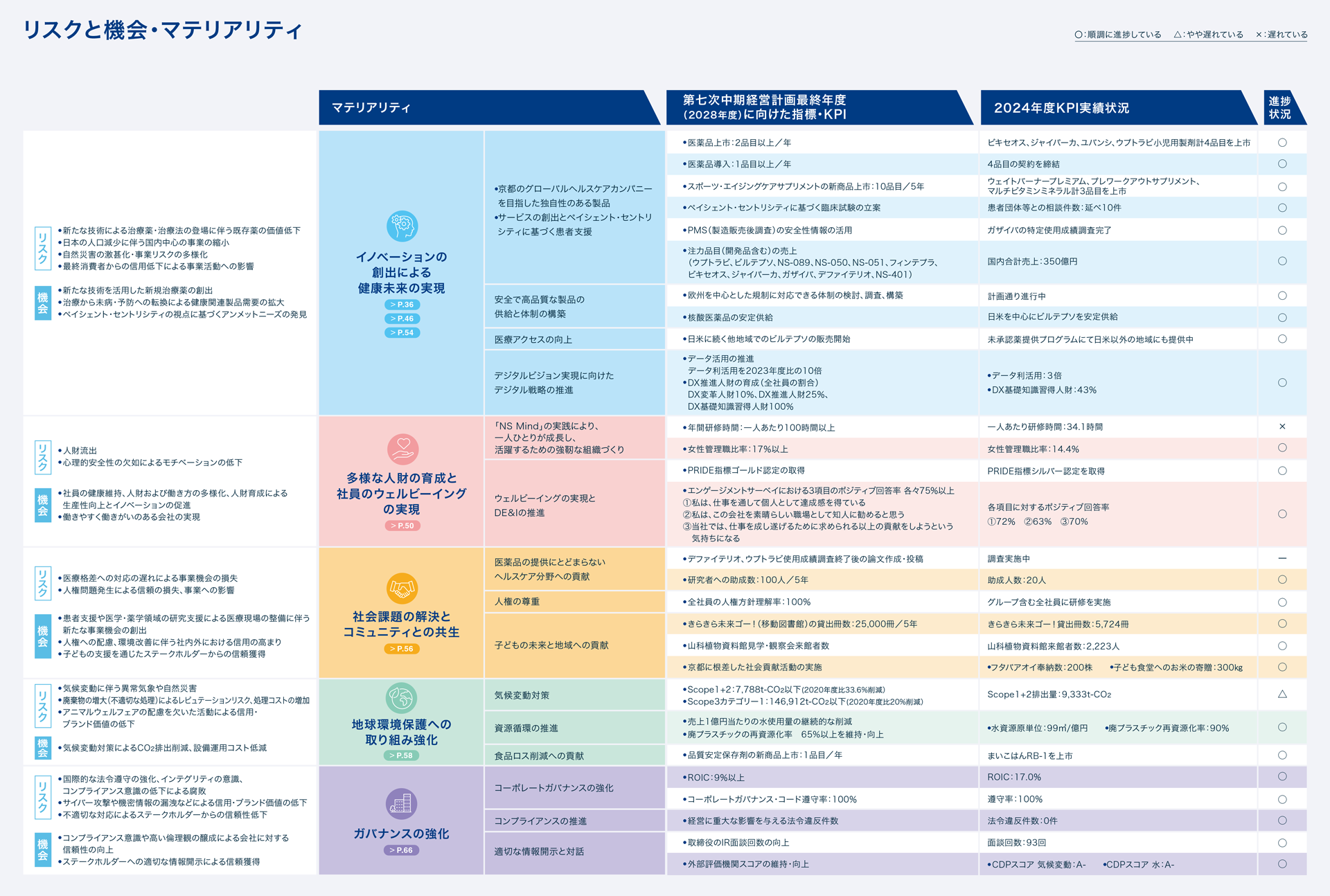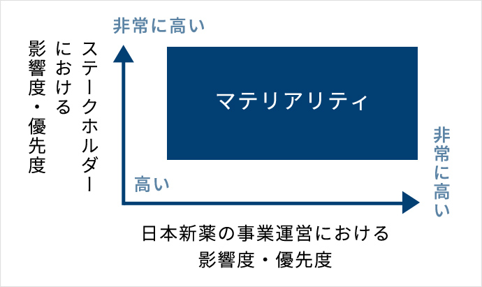 2021年4月、日本新薬グループでは社会やステークホルダーに対して果たすべきミッションを見定め、社会課題を解決し価値を創出する上で重要と考える19項目をマテリアリティとして特定しました。
